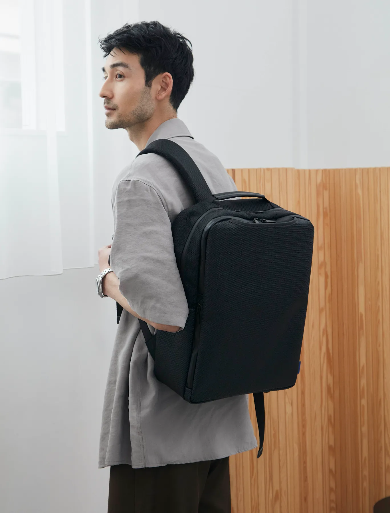 ミニマルなルックスとは裏腹に、実用性にもこだわり抜いたスマートなアイテムが完成。オーセンティックなトートを模した「RMB-002」は、雨や汚れに強く耐久性にも優れた型押しのPVC素材RHOMBUS(ランバス)をベースに、ハンドルとマチ面や底面部分に強度の高いナイロンを採用。驚きの軽量感を実現しました。内部にはPCも収納できるポケットだけでなくケーブルの収納に最適なメッシュポケットを併せて設計し、両サイドには折り畳み傘やボトルが収納できるスペース付き。荷物が多い時には中身を目隠しすることができるフラップも装備しています。どこまでも使い手のことを考えた細やかな機能性が使うほどに手放せなくなりそう。