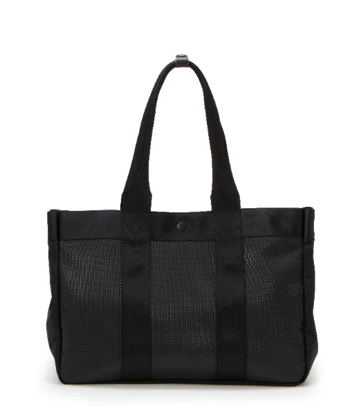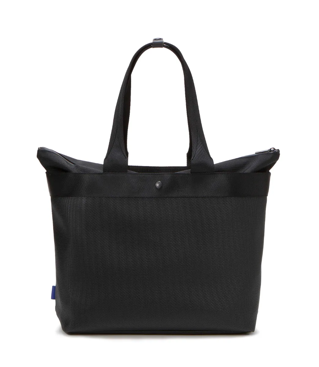 オンオフ活躍するビッグサイズのトート「RMB-001」は、雨や汚れに強く耐久性にも優れた型押しのPVC素材RHOMBUS(ランバス)をベースに、ハンドルには強度の高いナイロンを採用。内部にはPCも収納できるポケットだけでなくケーブルの収納に最適なメッシュポケットを併せて設計し、両サイドには折り畳み傘やボトルが収納できるスペースも装備しました。天面は雨の日にも安心な止水ファスナー付き。防犯面にも配慮しつつサッと取り出したい携帯や財布などは、トップのファスナーポケットへ収納がおすすめです。シーンを問わず毎日を共に過ごす、優秀な相棒になること間違いなし。