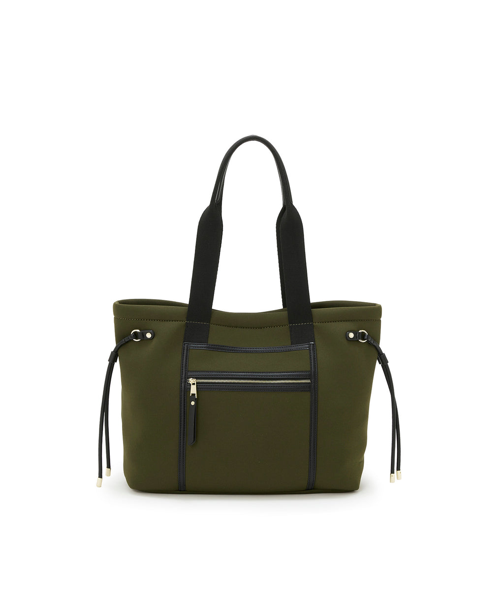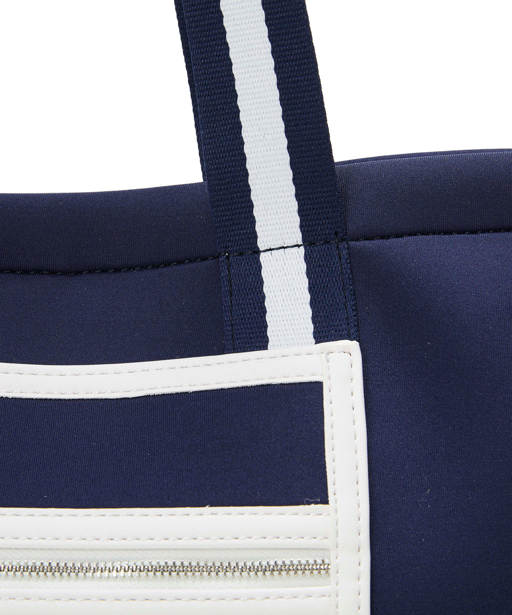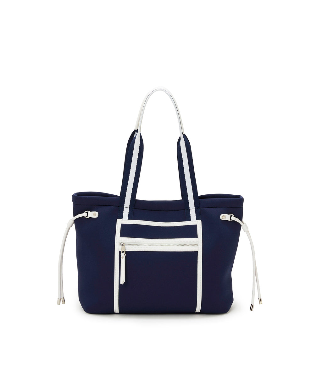 スポーティーな雰囲気のネオプレン素材に、ゴールドカラーの金具やフェイクレザーのパイピングをあしらいキレイめな雰囲気に仕上げました。