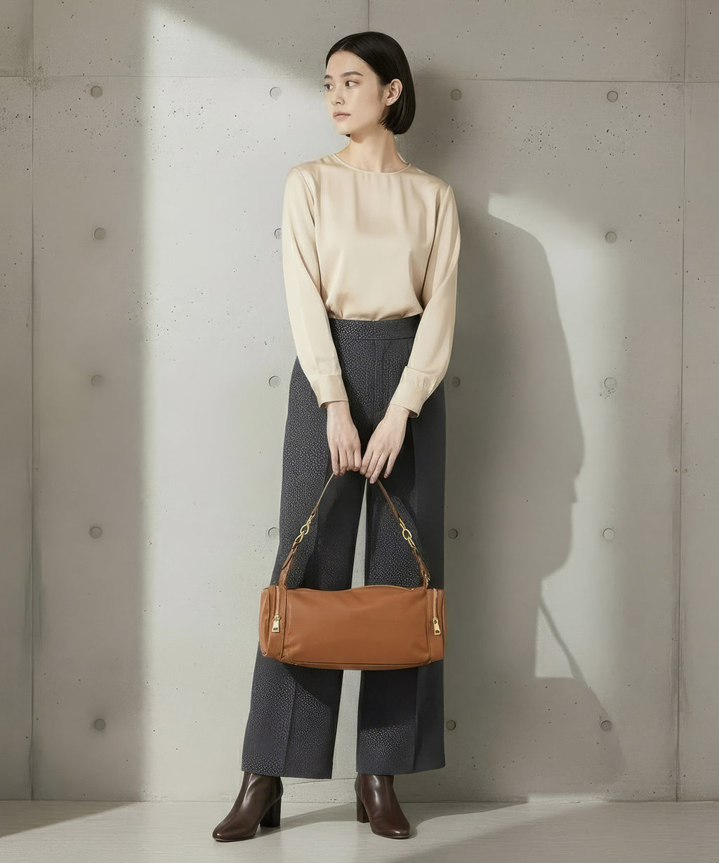 異素材ミックスながら同色のナイロン生地と牛革で仕立てた上品なデザイン。