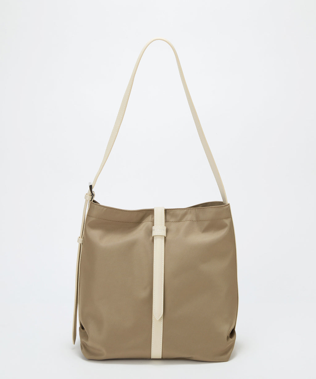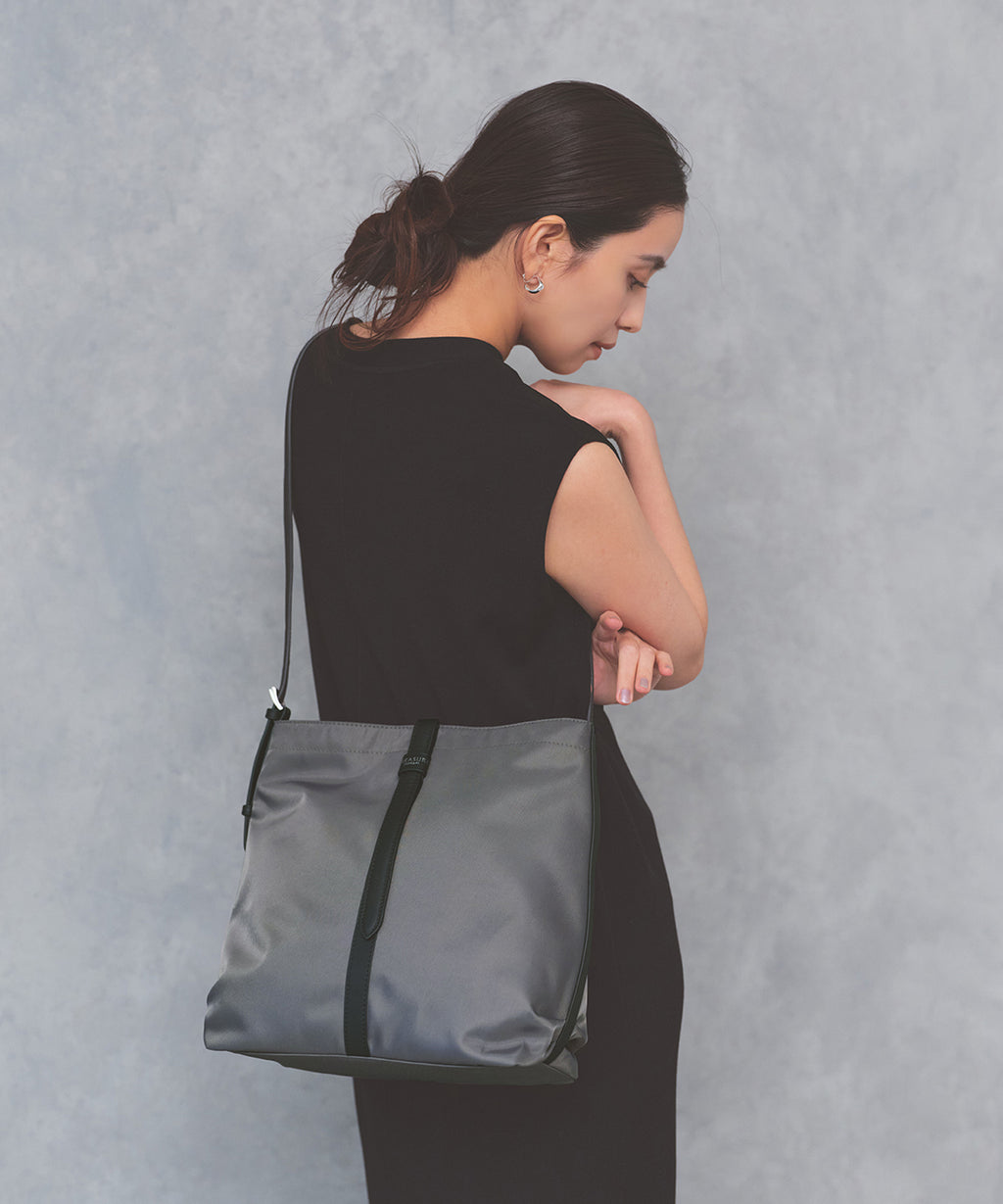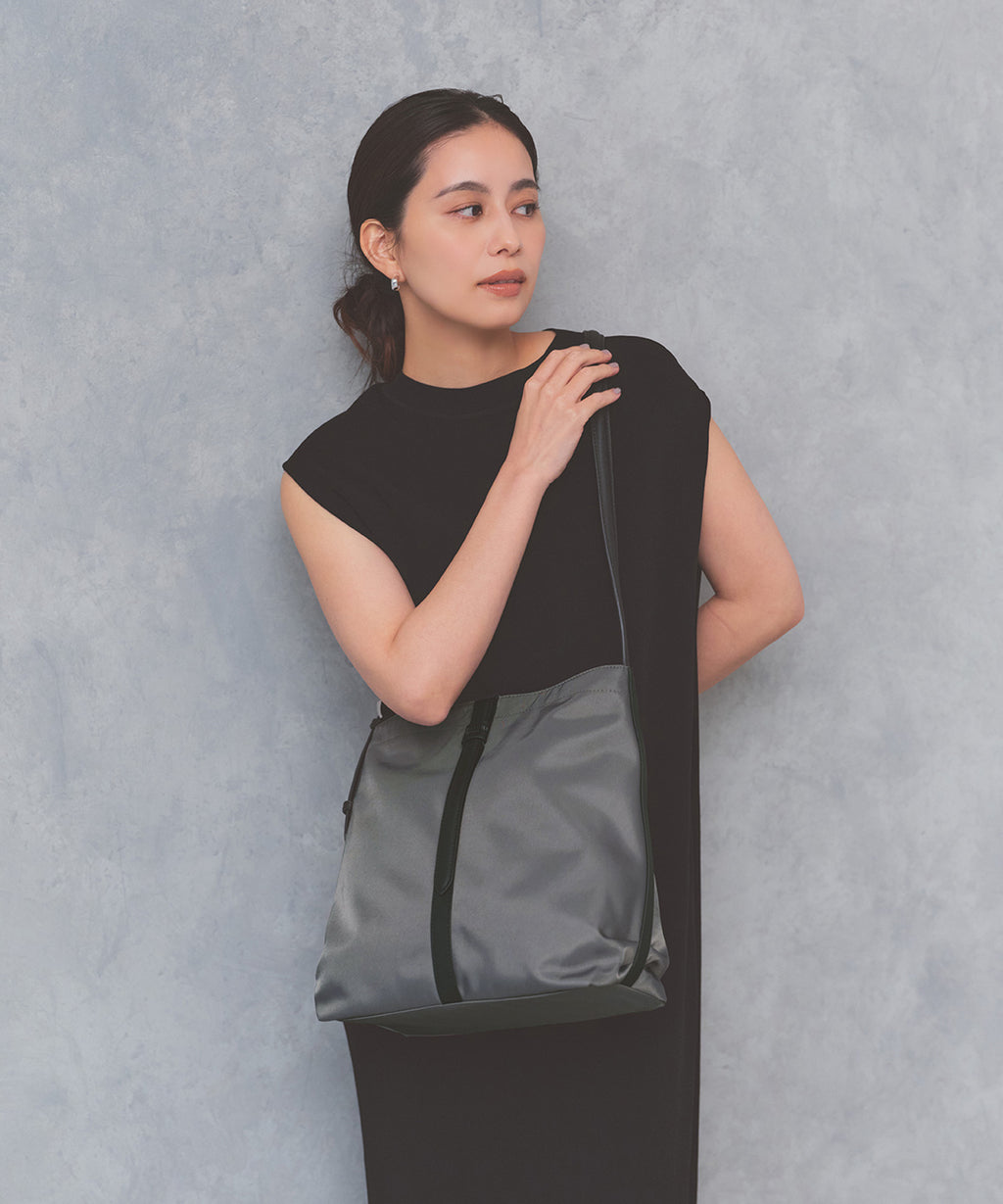 スタイルを選ばずに持てるブラックとベルトのバイカラーがポイントのミディアムグレー、グレージュの3色をラインナップ。