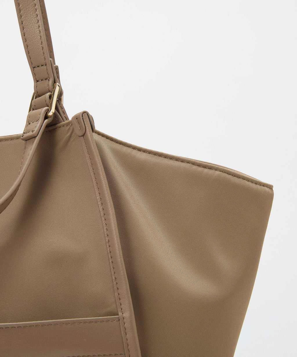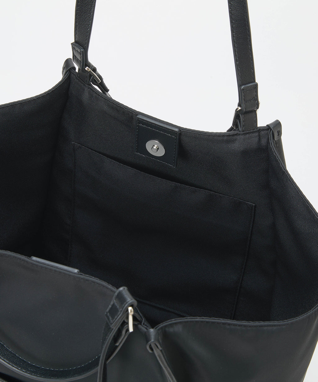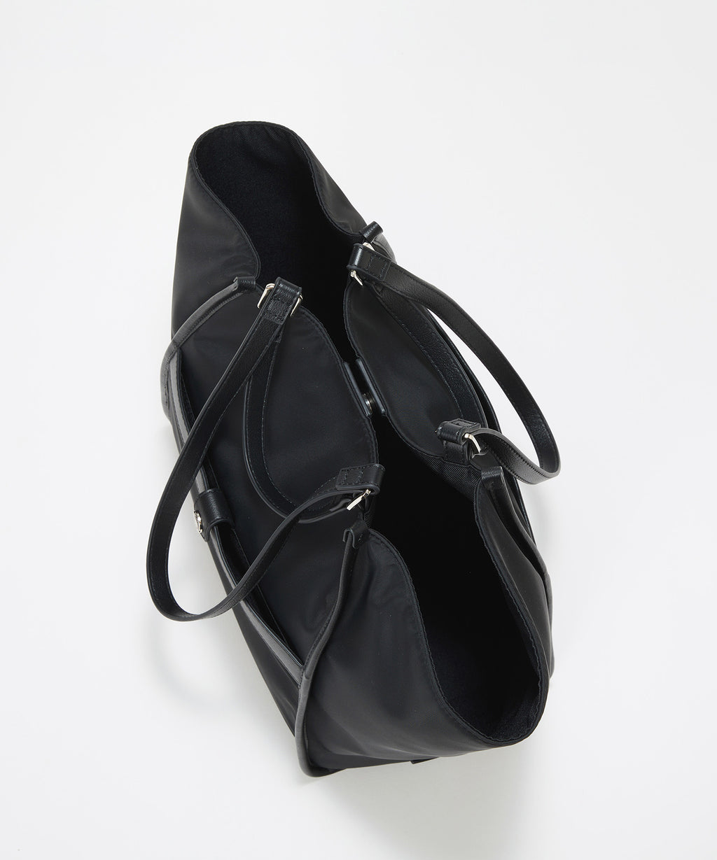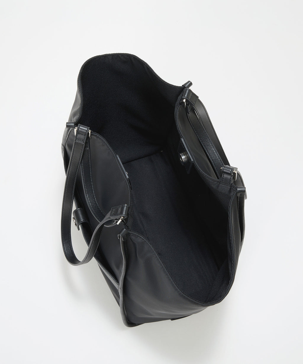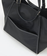 光沢感のあるナイロン素材に牛革のハンドルを合わせたキレイめカジュアルなデザイン。