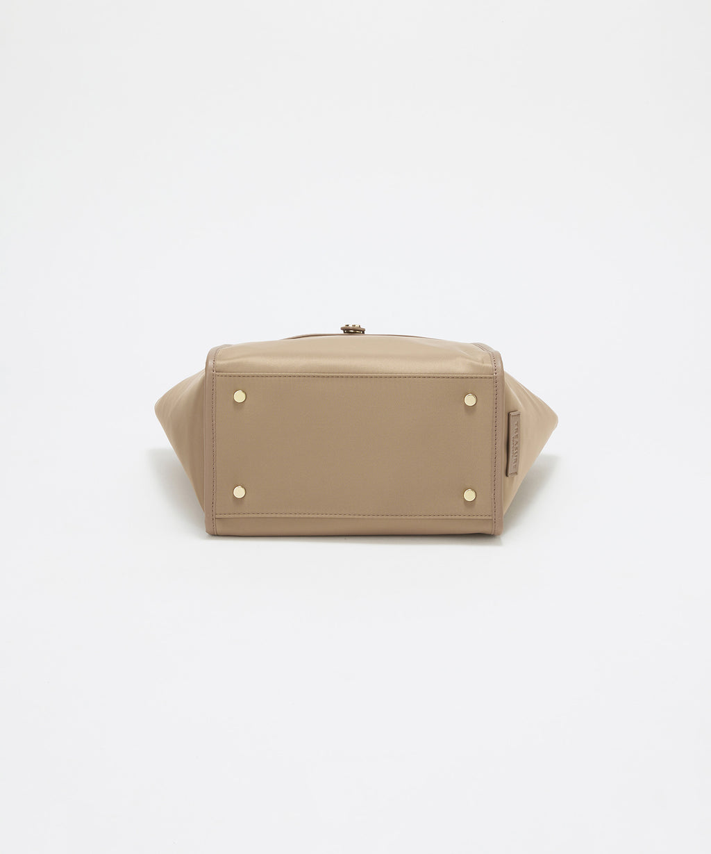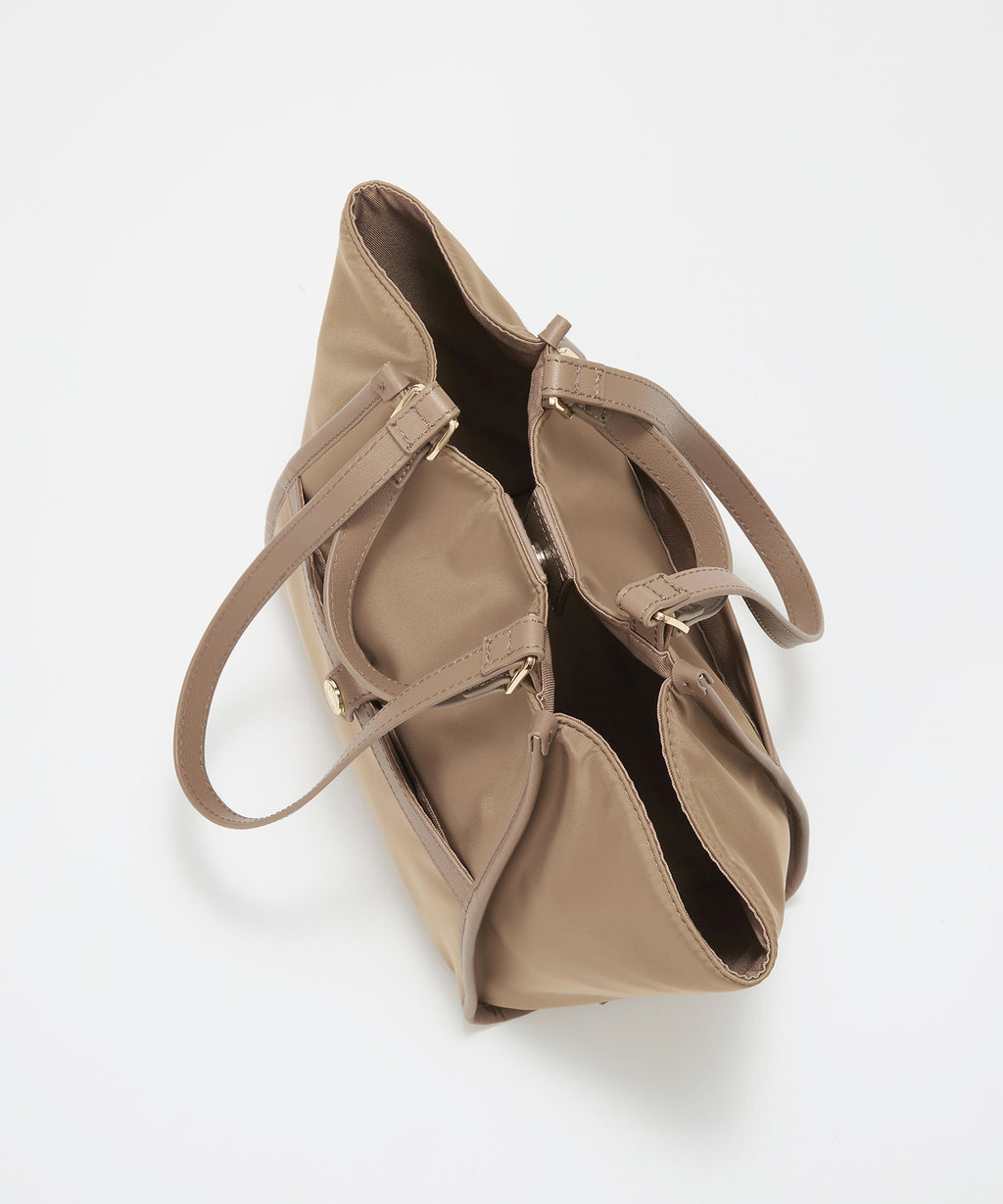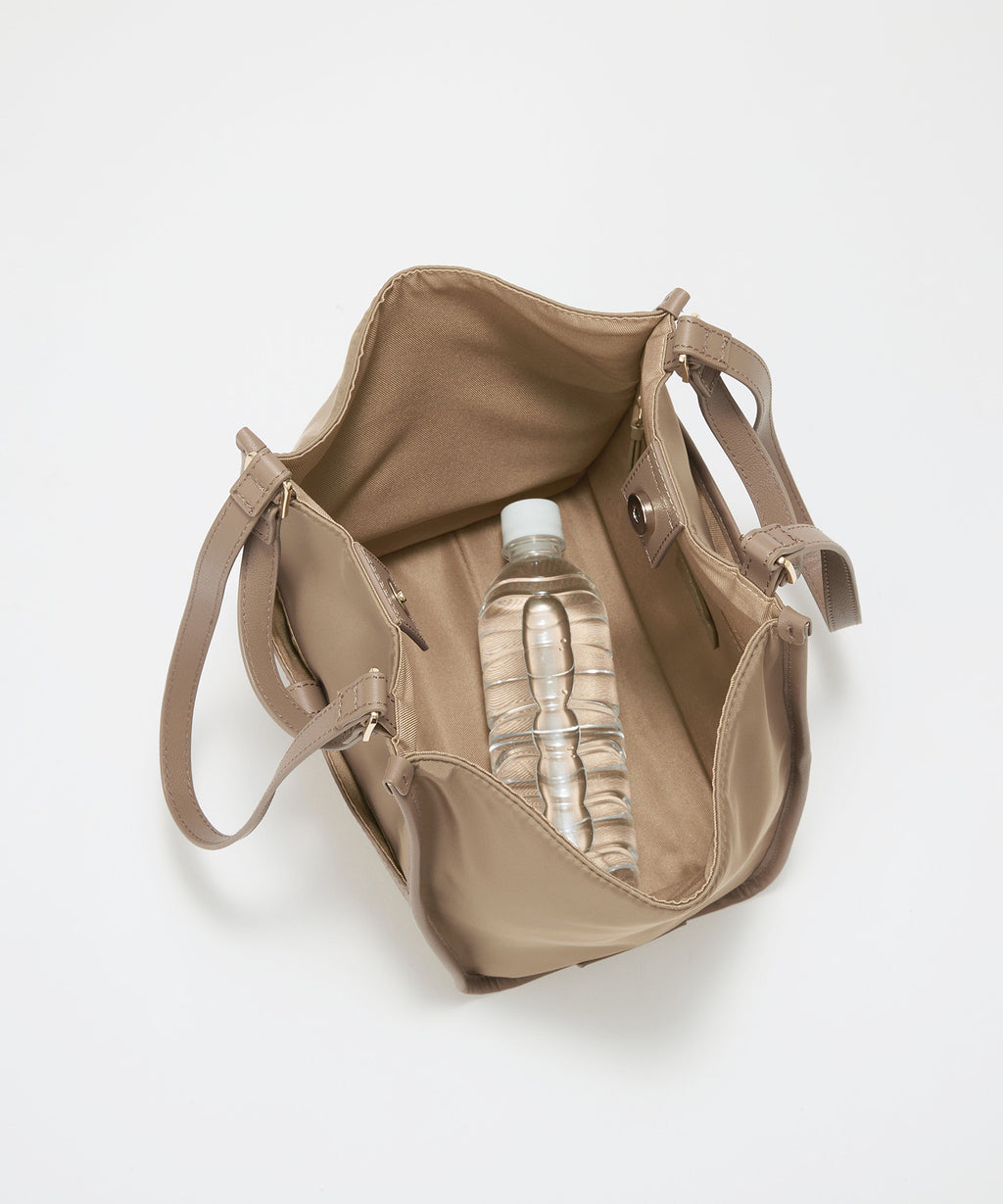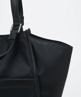 光沢感のあるナイロン素材に牛革のハンドルを合わせたキレイめカジュアルなデザイン。