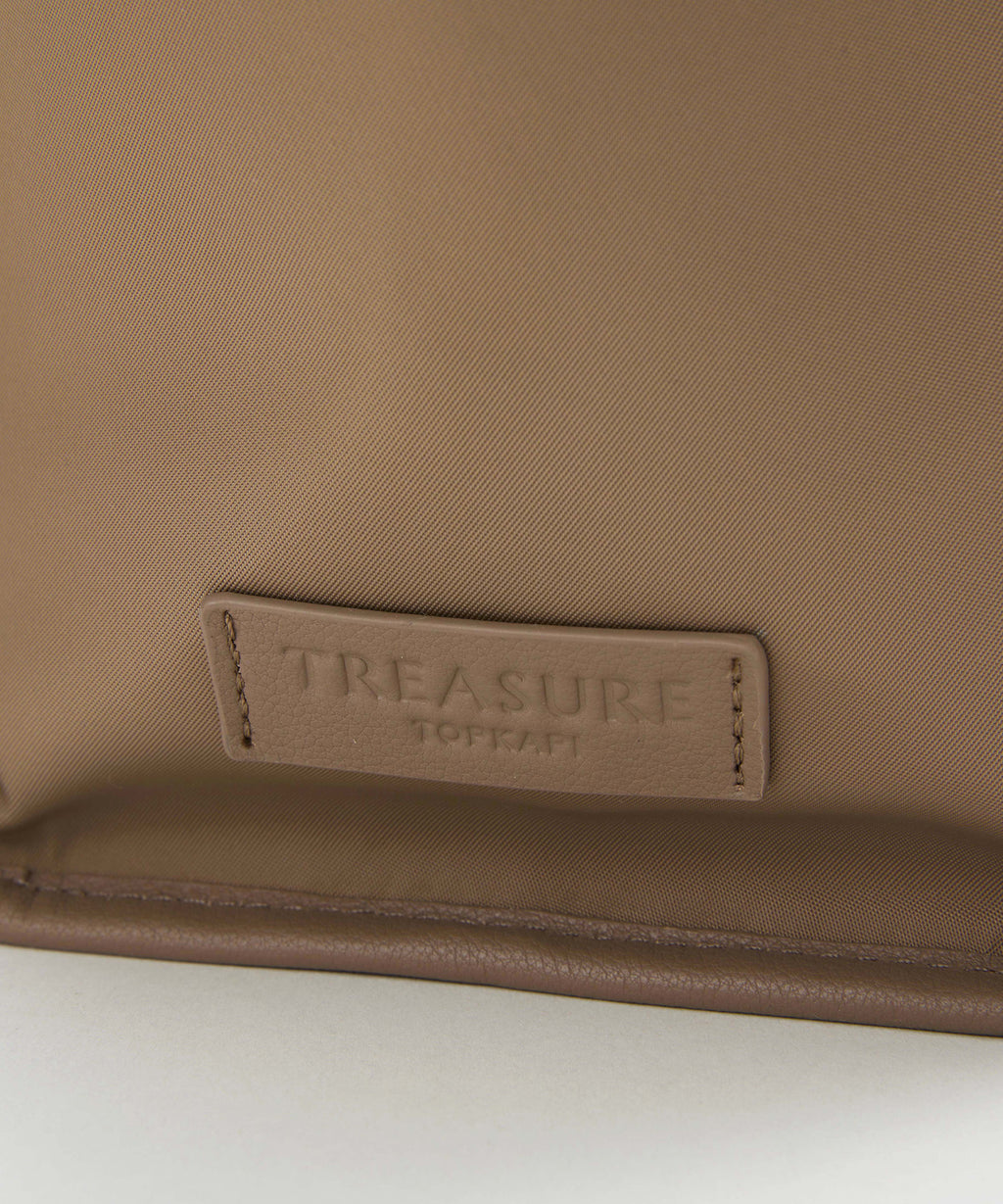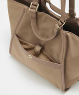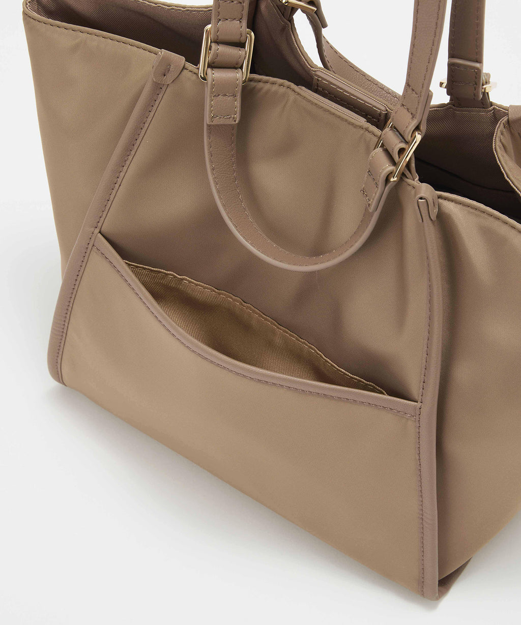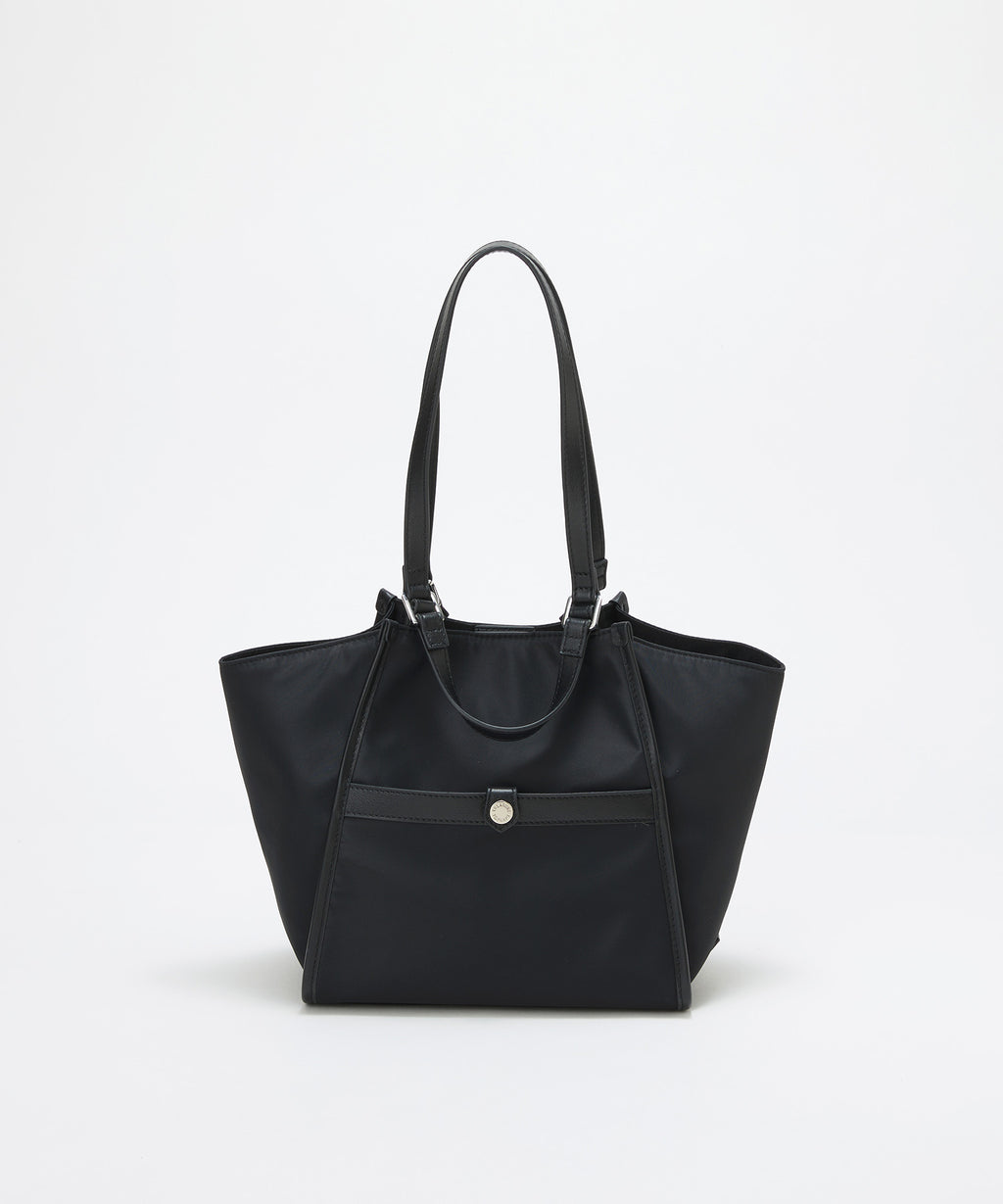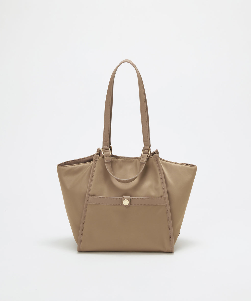 光沢感のあるナイロン素材に牛革のハンドルを合わせたキレイめカジュアルなデザイン。