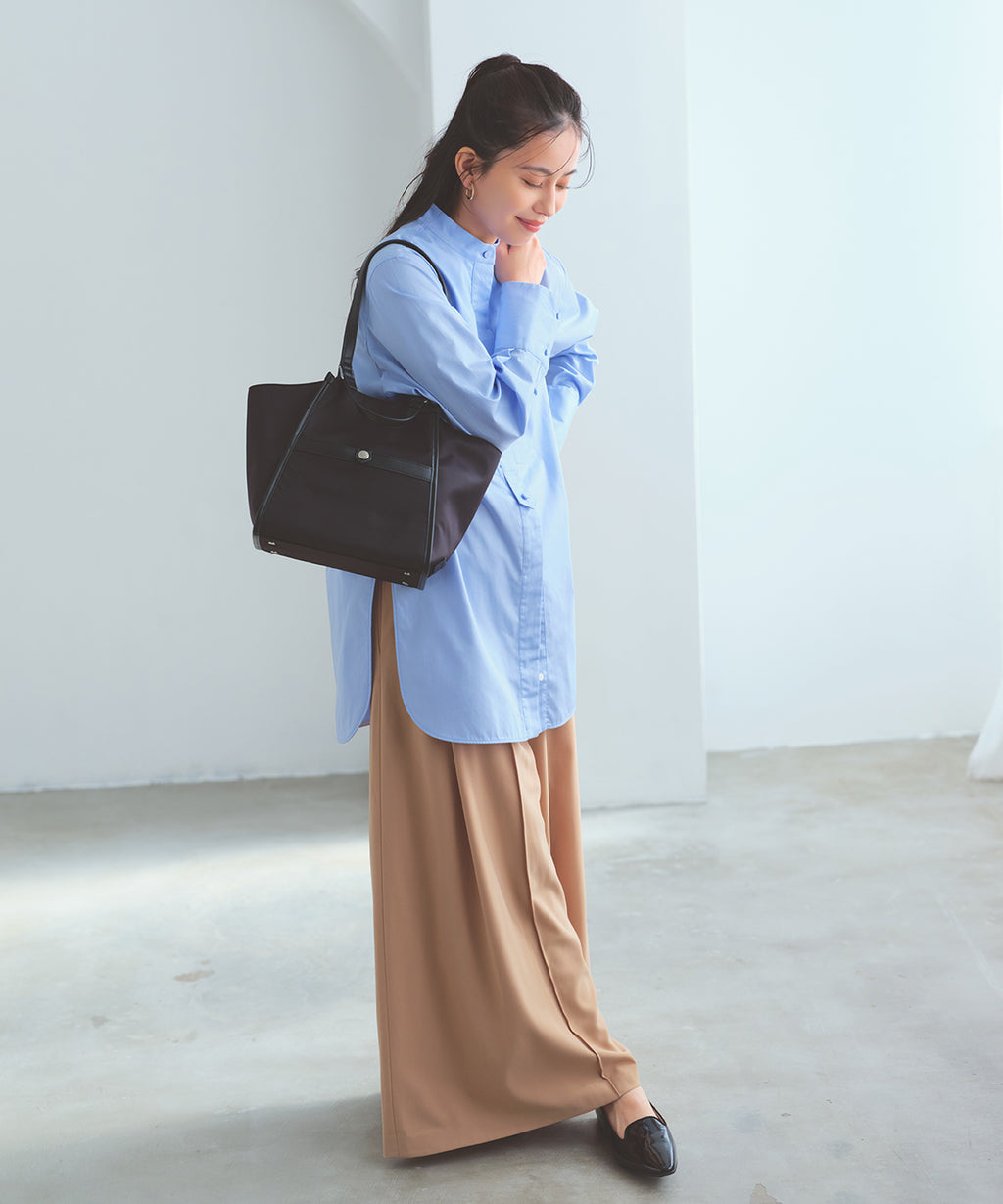 コンパクトなサイズながらマチがたっぷりあるので、長財布やドリンクボトル、折りたたみ傘など、持ち歩きたい荷物がすっきり収まります。