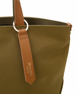 カラビナで下げたロゴ入りのレザータグがリッチなワンポイント。