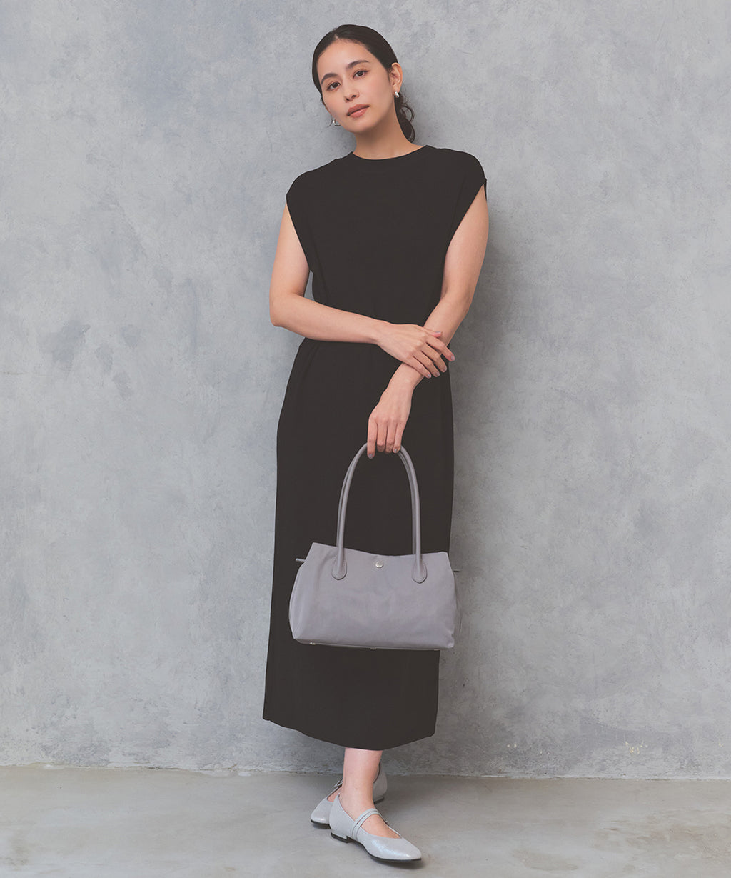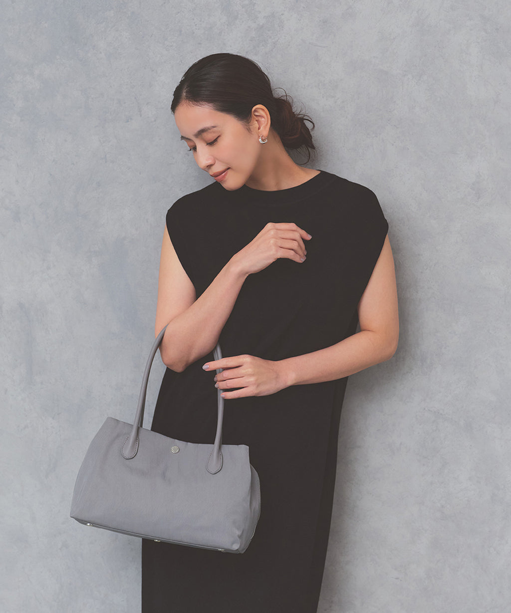 ハンドルとトップ部分にレザーを配し、カジュアルすぎず大人顔へと引き締めるスパイスに。