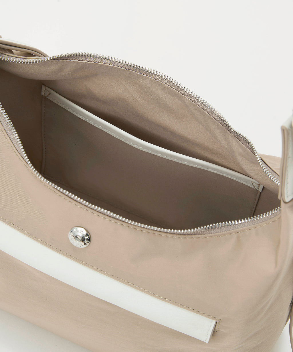 背面にはレザーのフラップ付きファスナーポケット、内側には2つのポケットを設計し、細かい仕分けも叶えます。