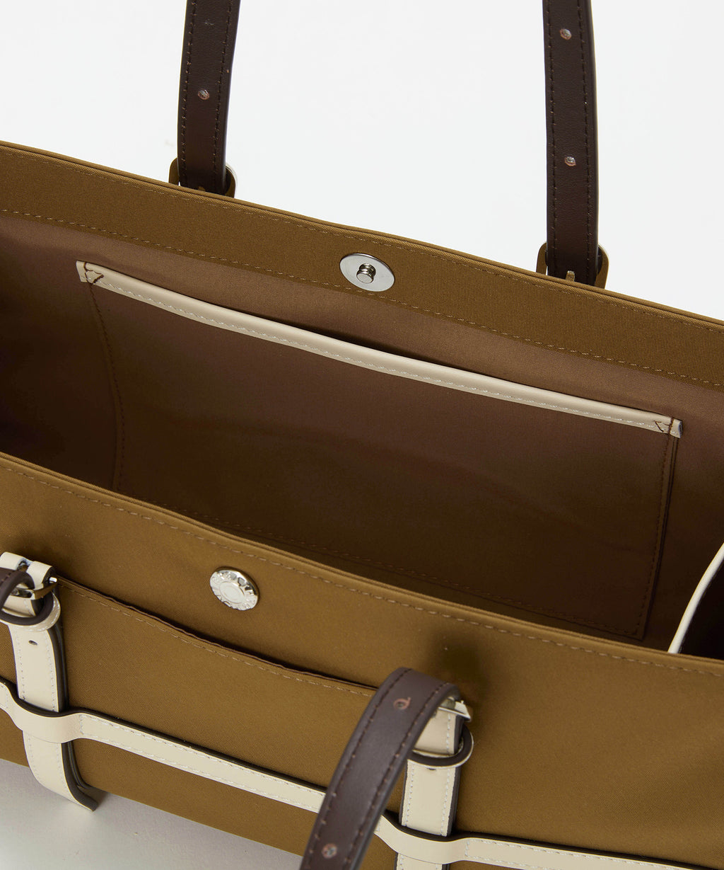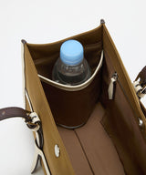 内側には、中身の目隠しとしても使えるファスナー付きのフラップポケットに加え、大きな平ポケット、ドリンクや折りたたみ傘を立てて収納できるボトルホルダーも備えています。
