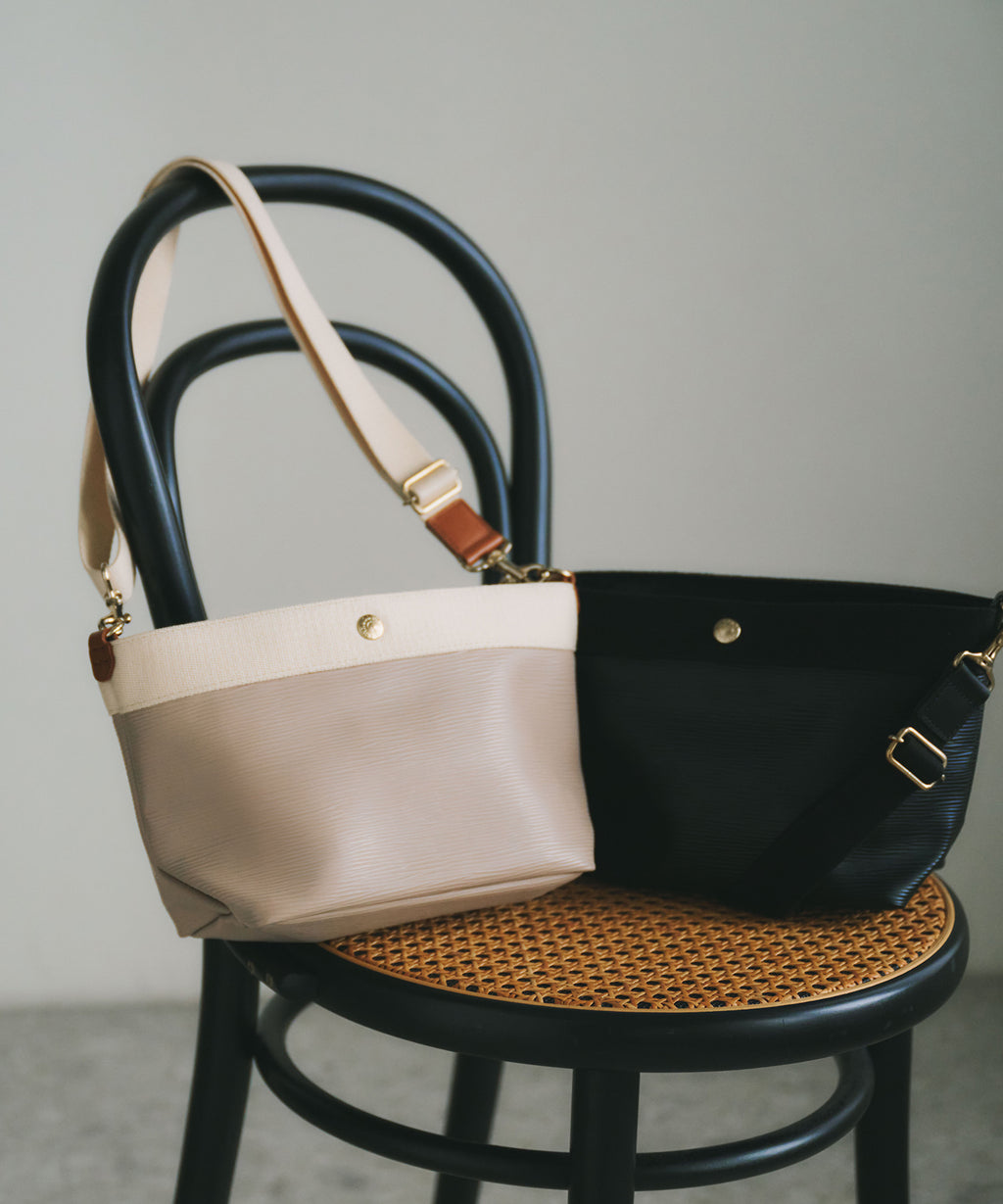 PVC素材にさざ波のような型押しを施した、クールな表情が人気のシリーズ。傷や汚れが目立ちにくく軽量で、デイリーユースに最適。国産の生地、縫製にこだわった丁寧なものづくり。