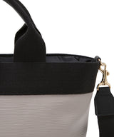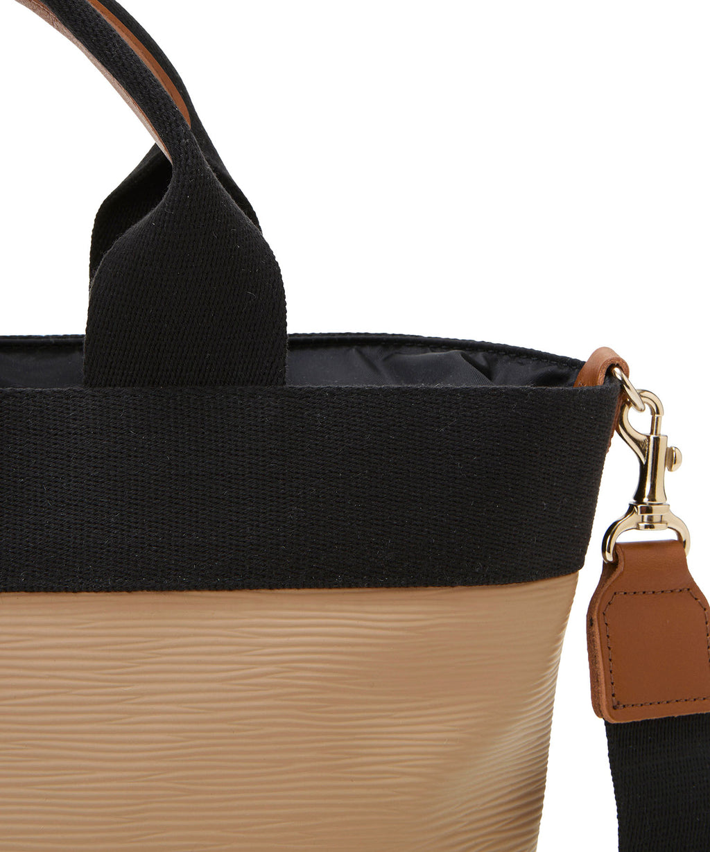 レザー調のボディに、太めのテープがぐるりと配された削ぎ落とされたシンプルなデザイン。ハンドルのレザーディティールもリッチなワンポイントに。