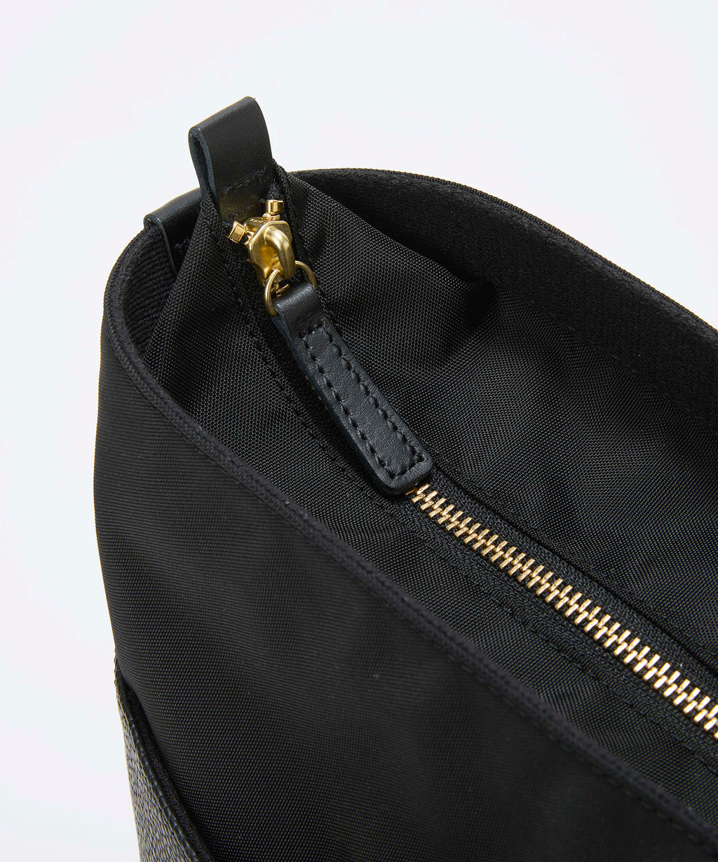 肩掛けしやすいレザーのロングハンドルの裏面には、身体への当たりをソフトにするテープをあしらい使い心地も快適です。