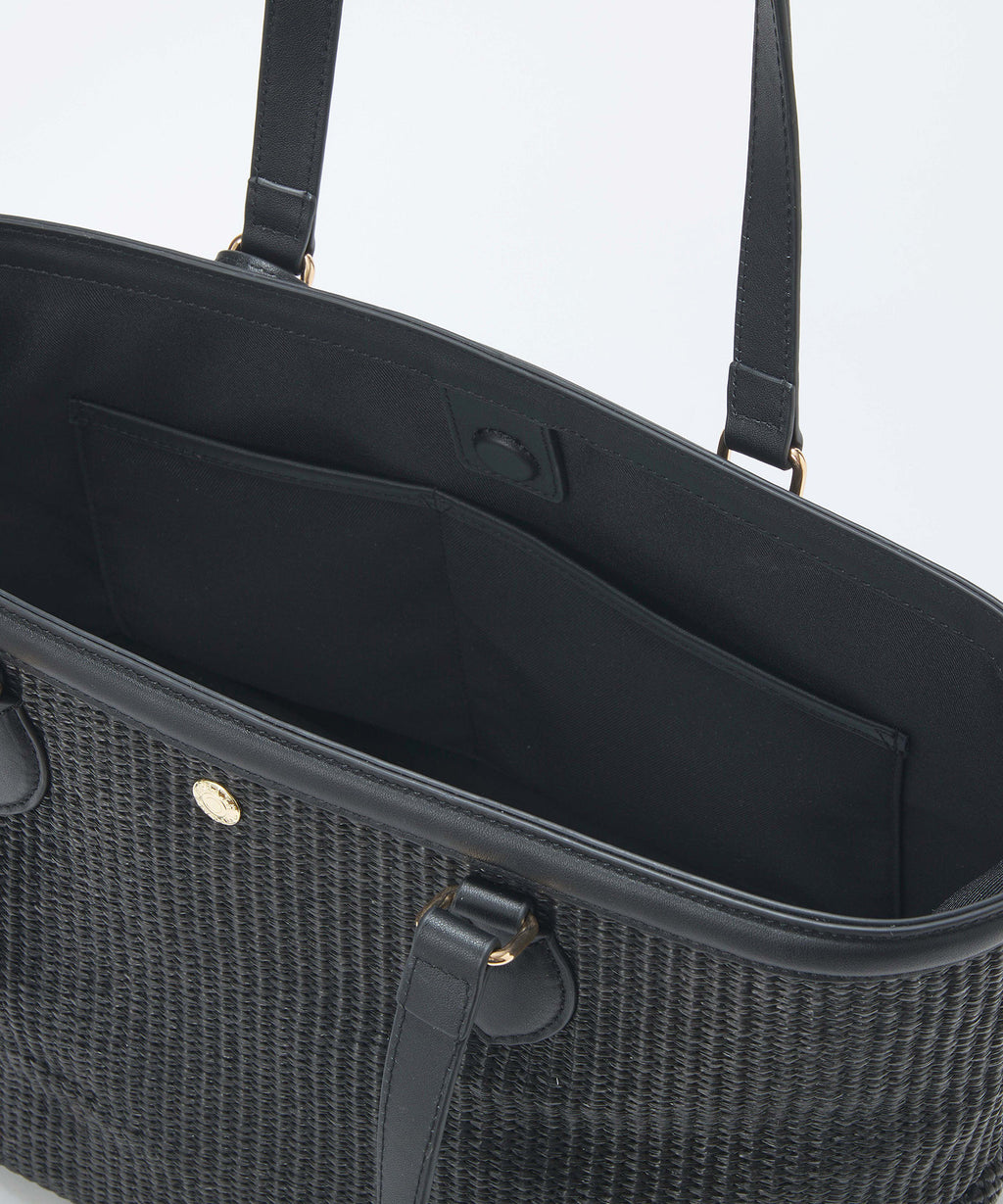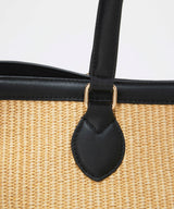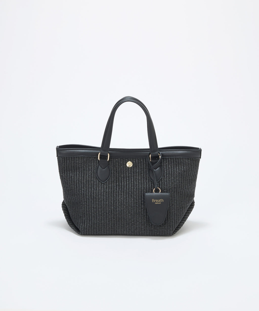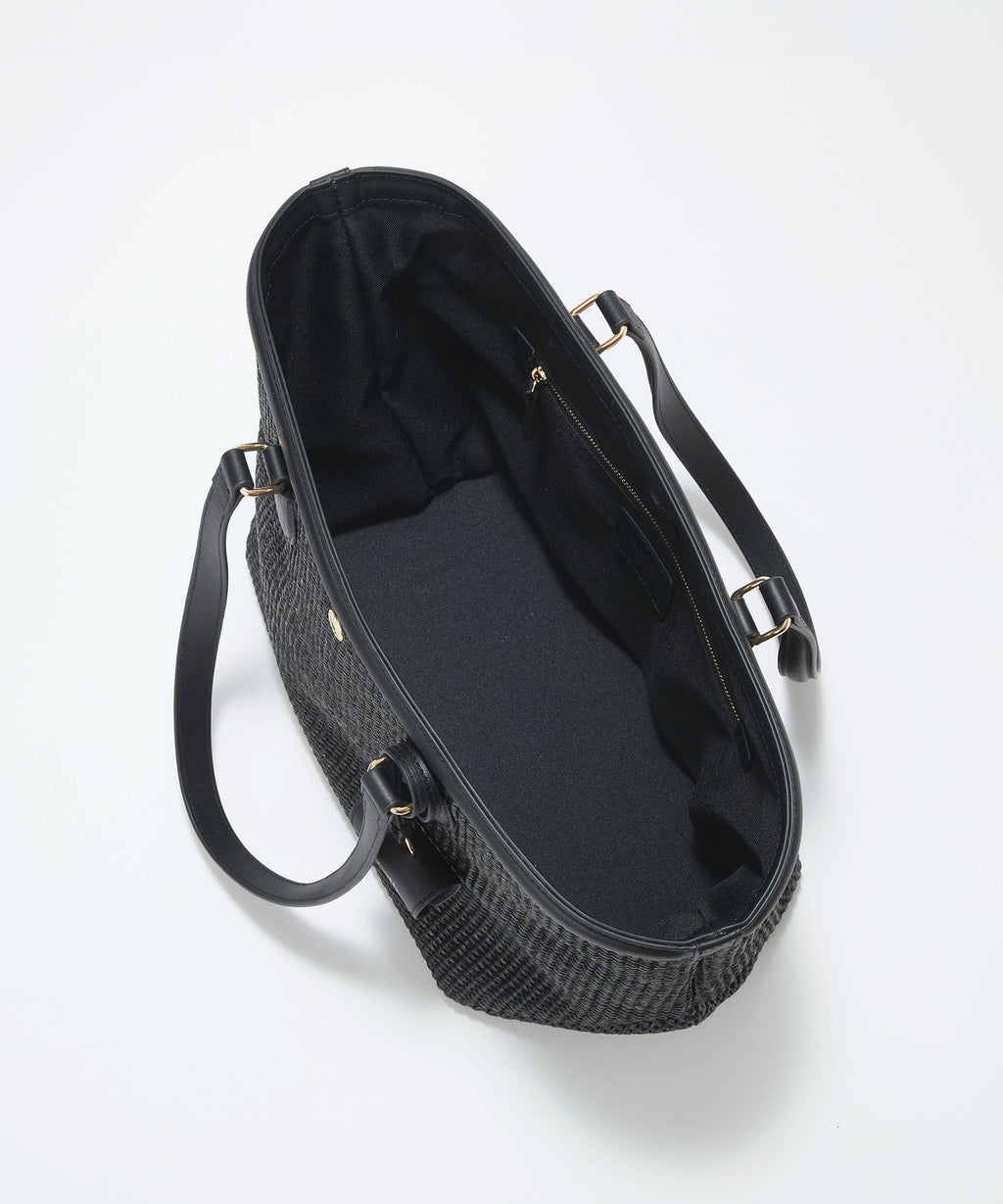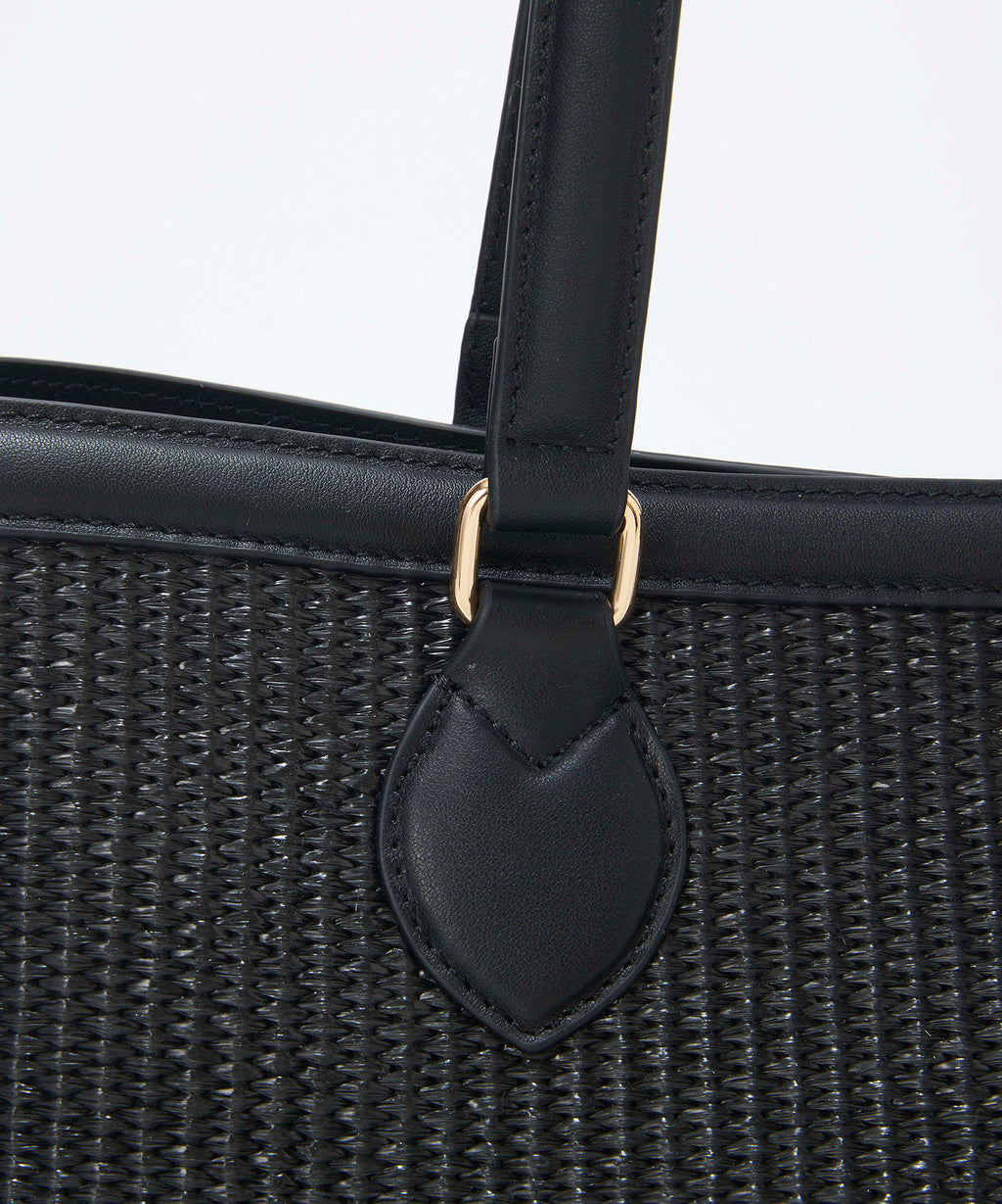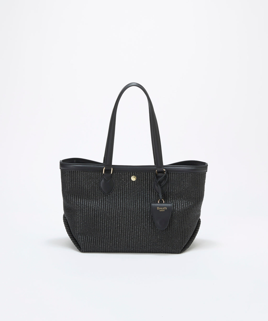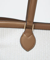天然素材のような表情のポリプロピレン素材に、レザーをあしらったトートバッグ。