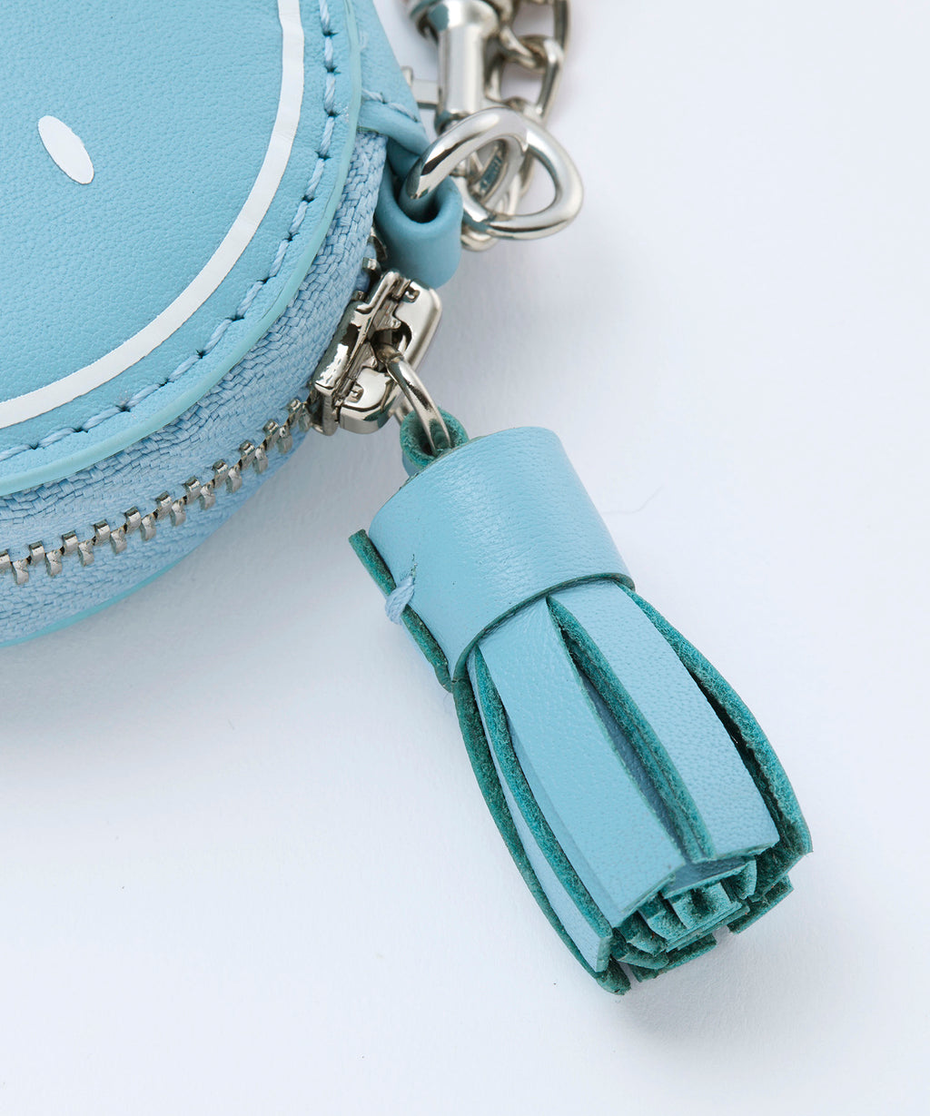 滑らかなタッチのスムースレザーにスマイルをプリントしたコロンとかわいいチャームポーチです。