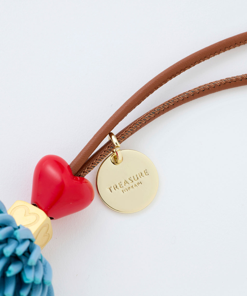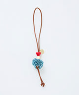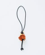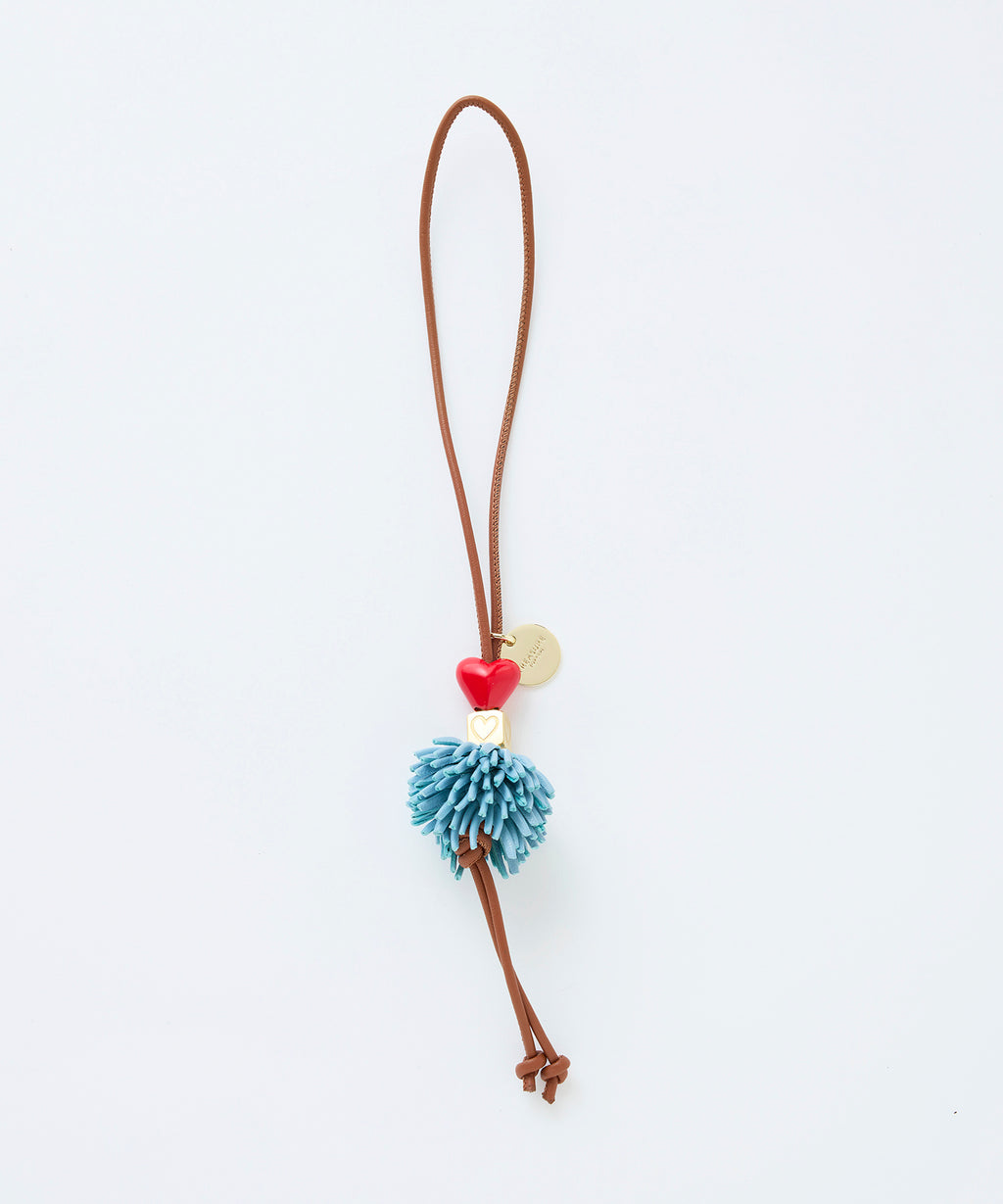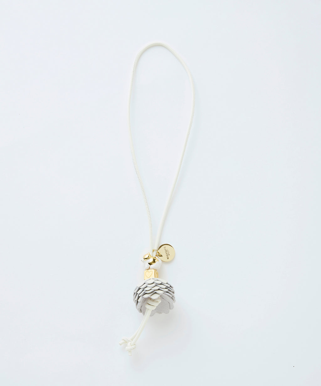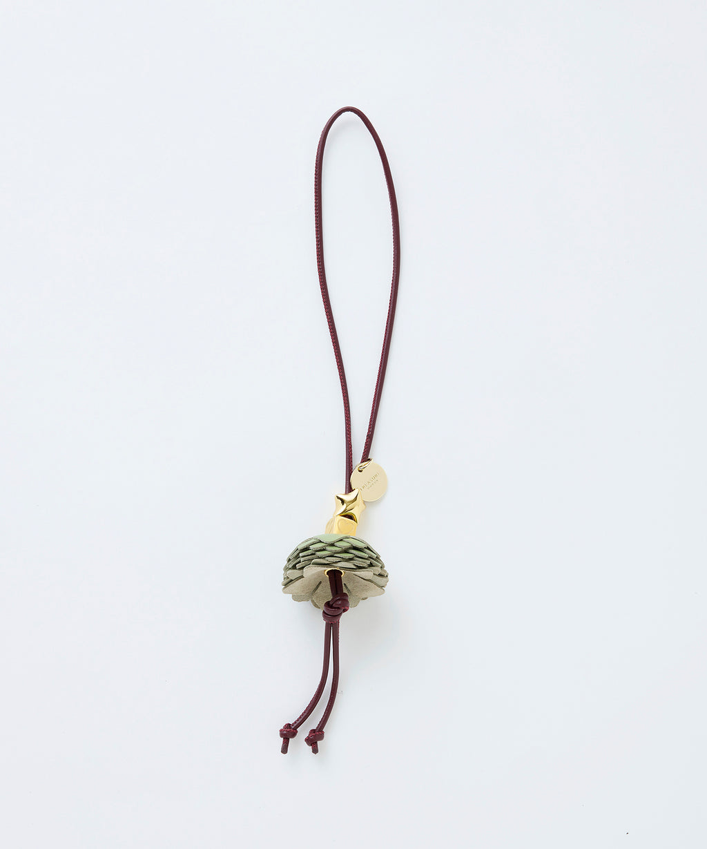 花びらのような形のレザーを重ね、メタルのパーツとブランドプレートを合わせたチャームです。